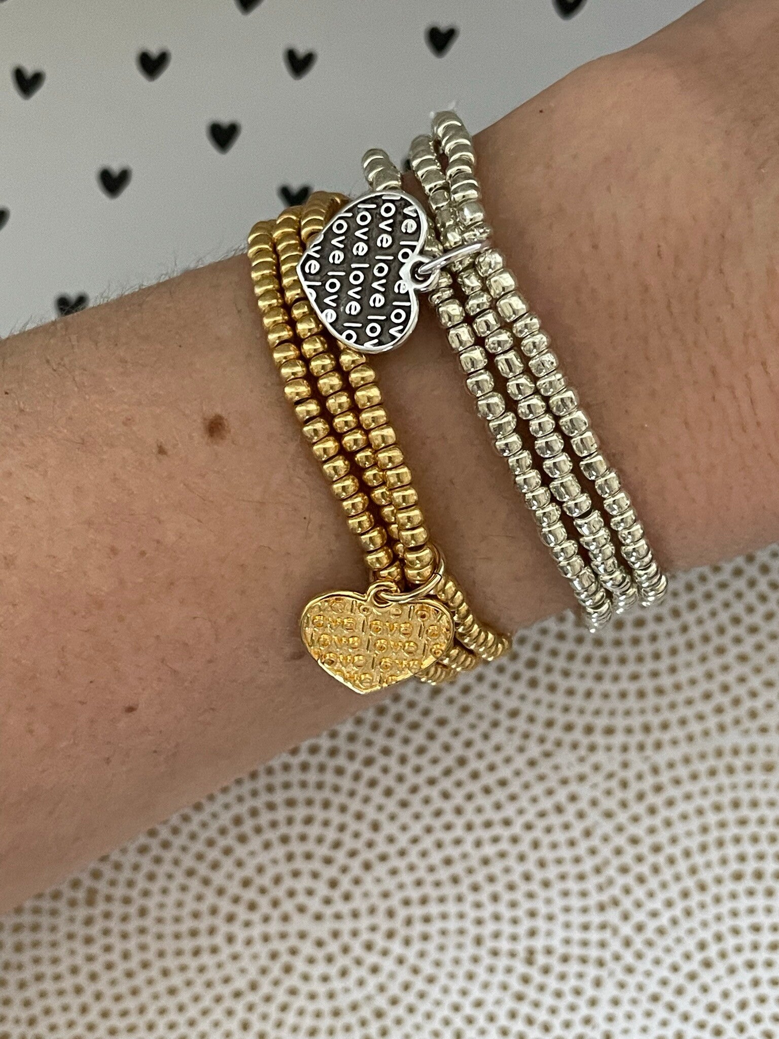 Set van drie gouden kralen armbandjes die bij elkaar worden gehouden door een leuke hartjes bedel.