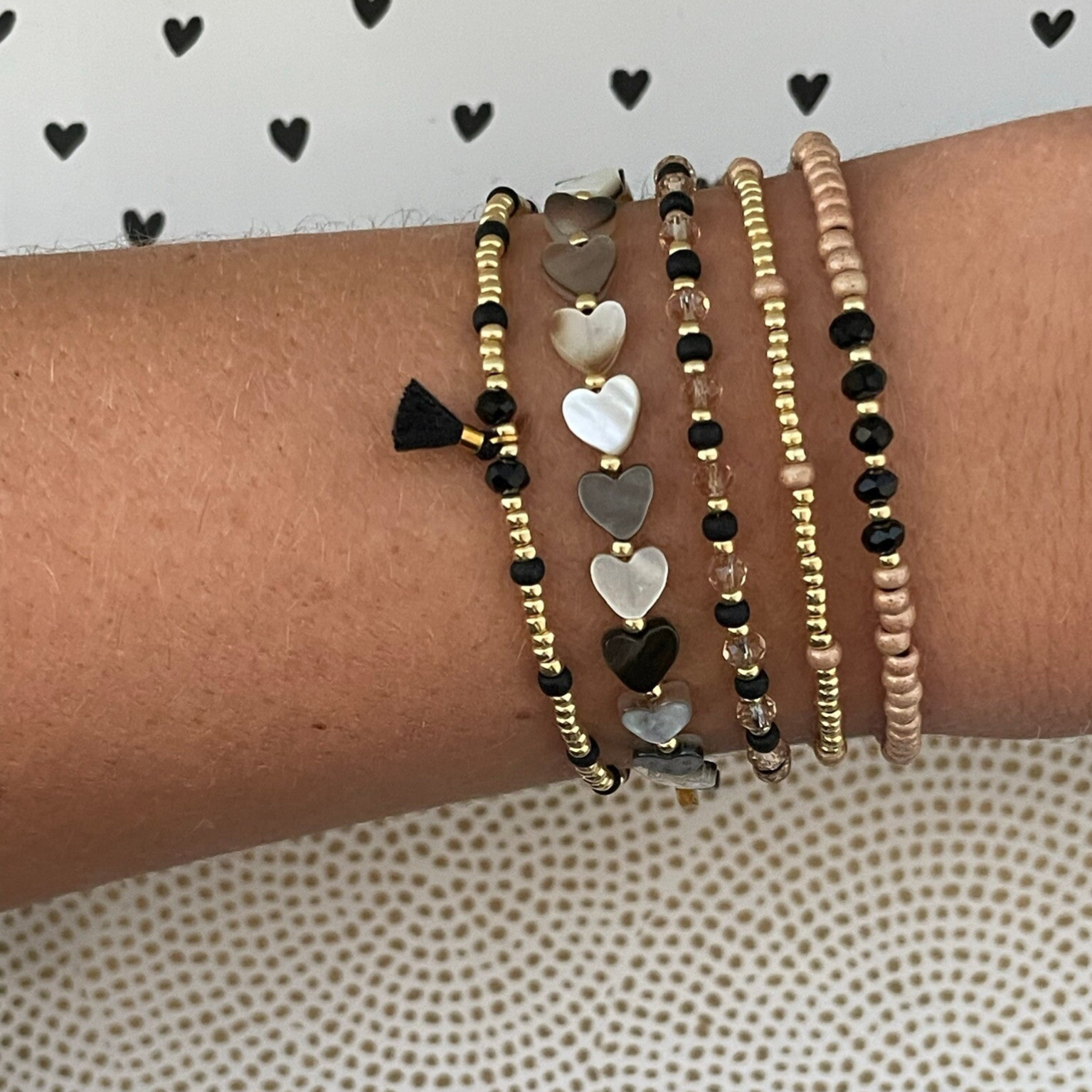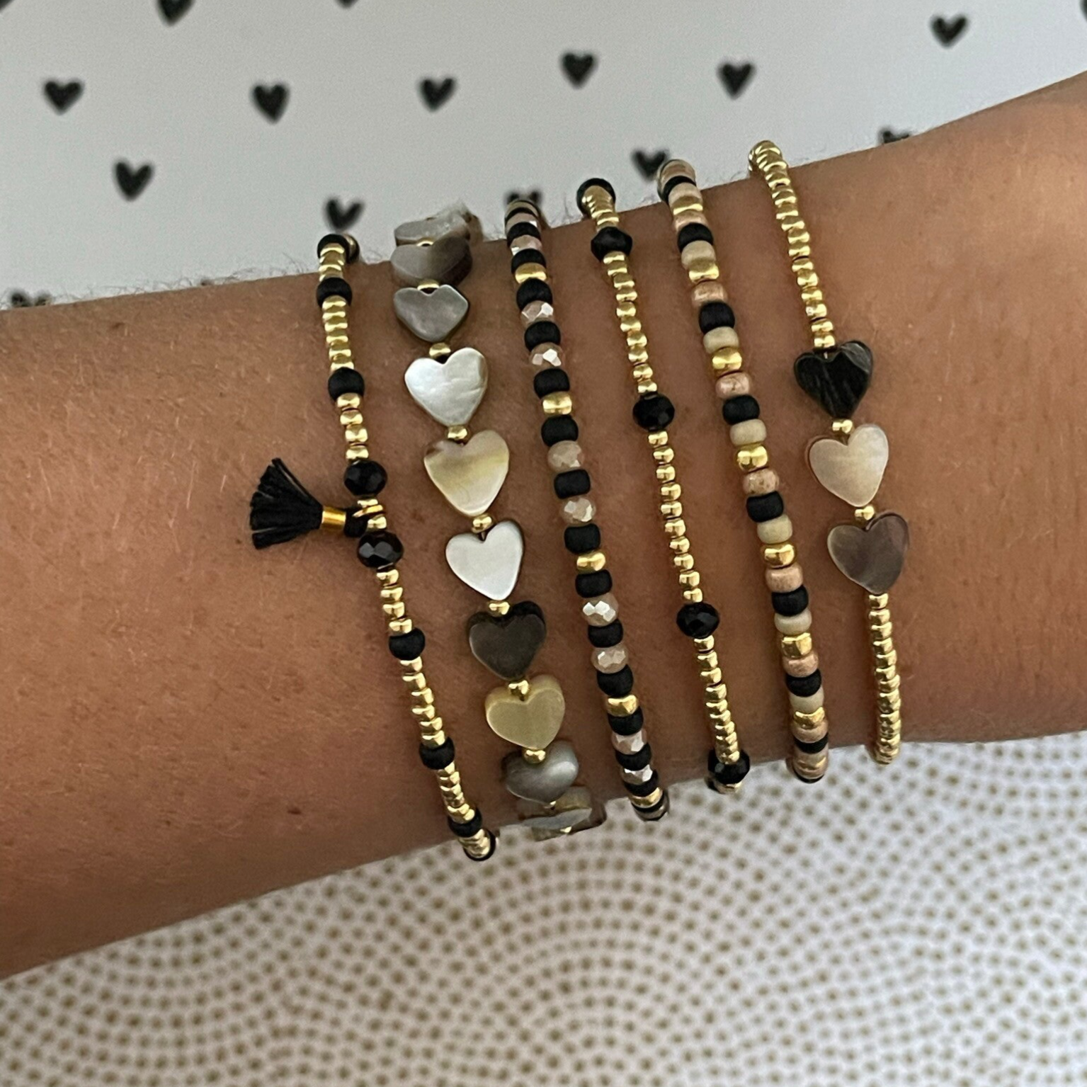 Je kunt de armbanden allemaal super mooi met elkaar mixen en matchen. De kralen zijn 2mm of 3mm miyuki rocailles glaskralen van zeer goede kwaliteit gecombineerd met prachtige facetkralen. Alles in de kleuren, zwart, goud, taupe & caramel.