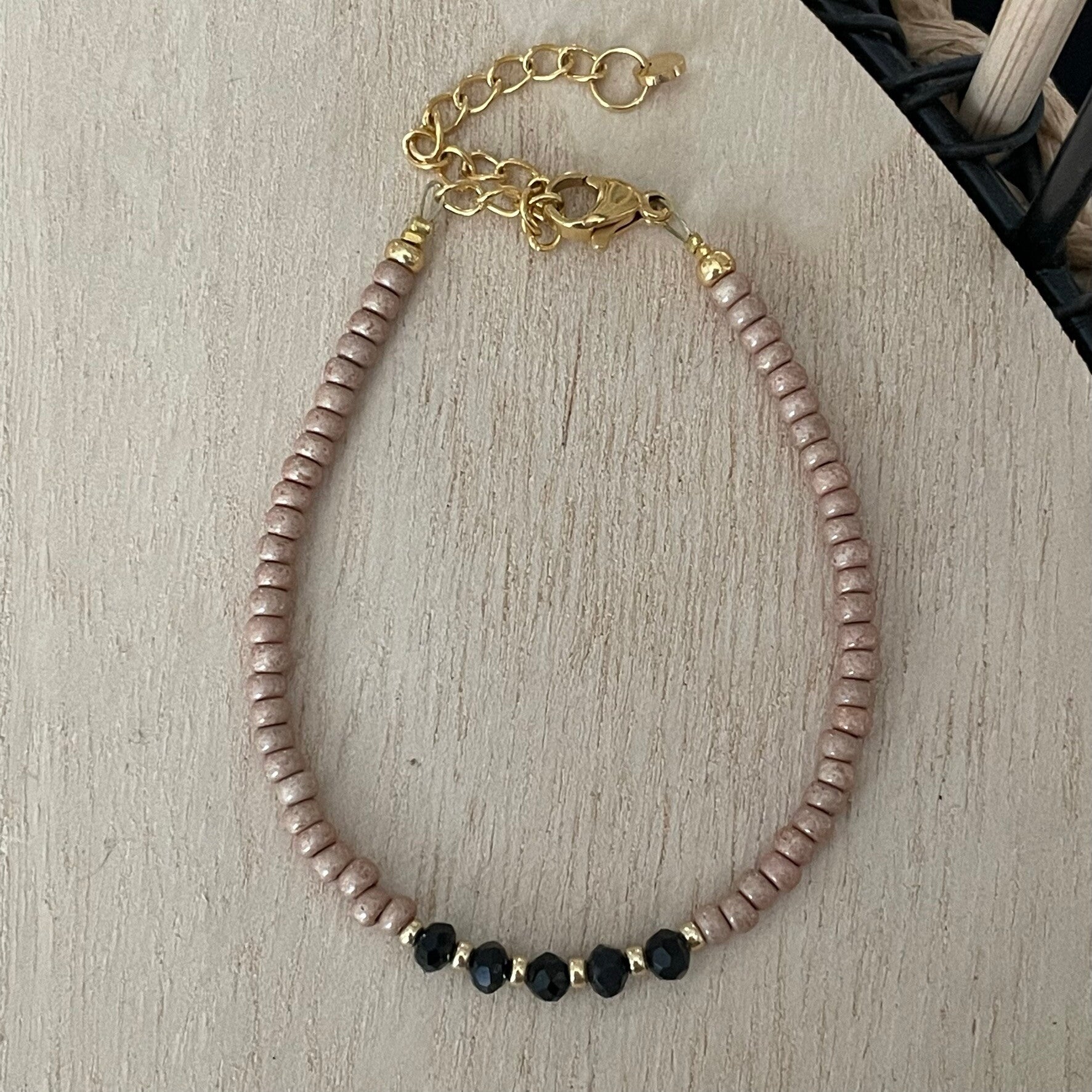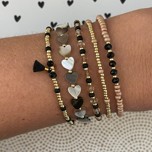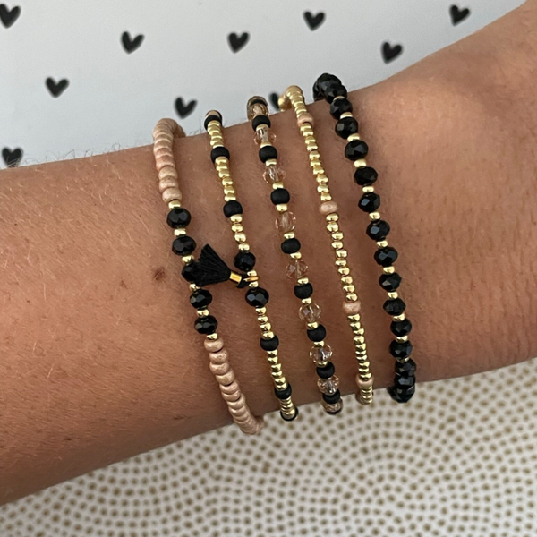 Je kunt de armbanden allemaal super mooi met elkaar mixen en matchen. De kralen zijn 2mm of 3mm miyuki rocailles glaskralen van zeer goede kwaliteit gecombineerd met prachtige facetkralen. Alles in de kleuren, zwart, goud, taupe & caramel.