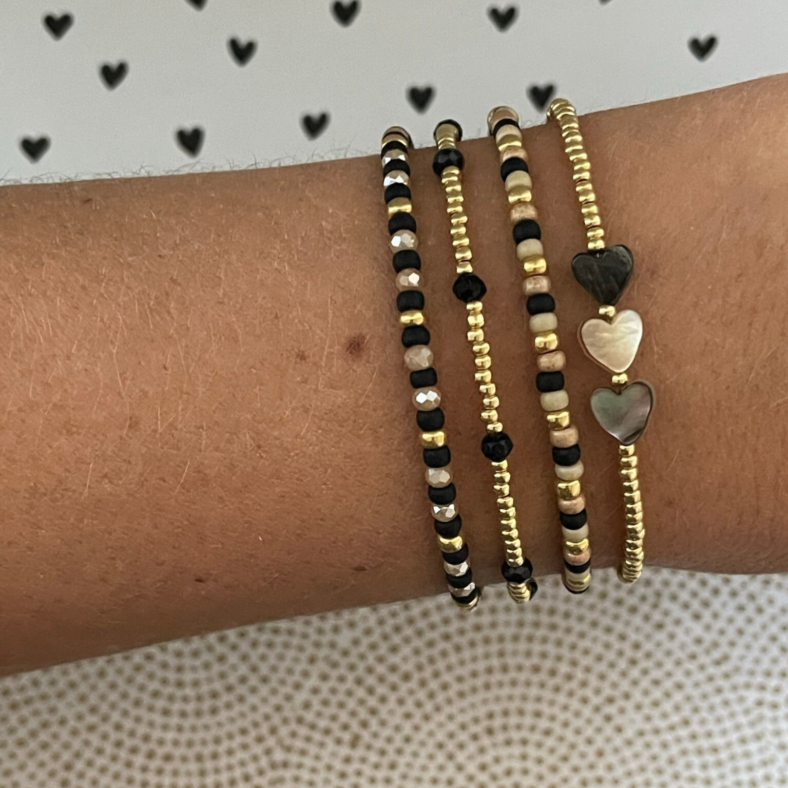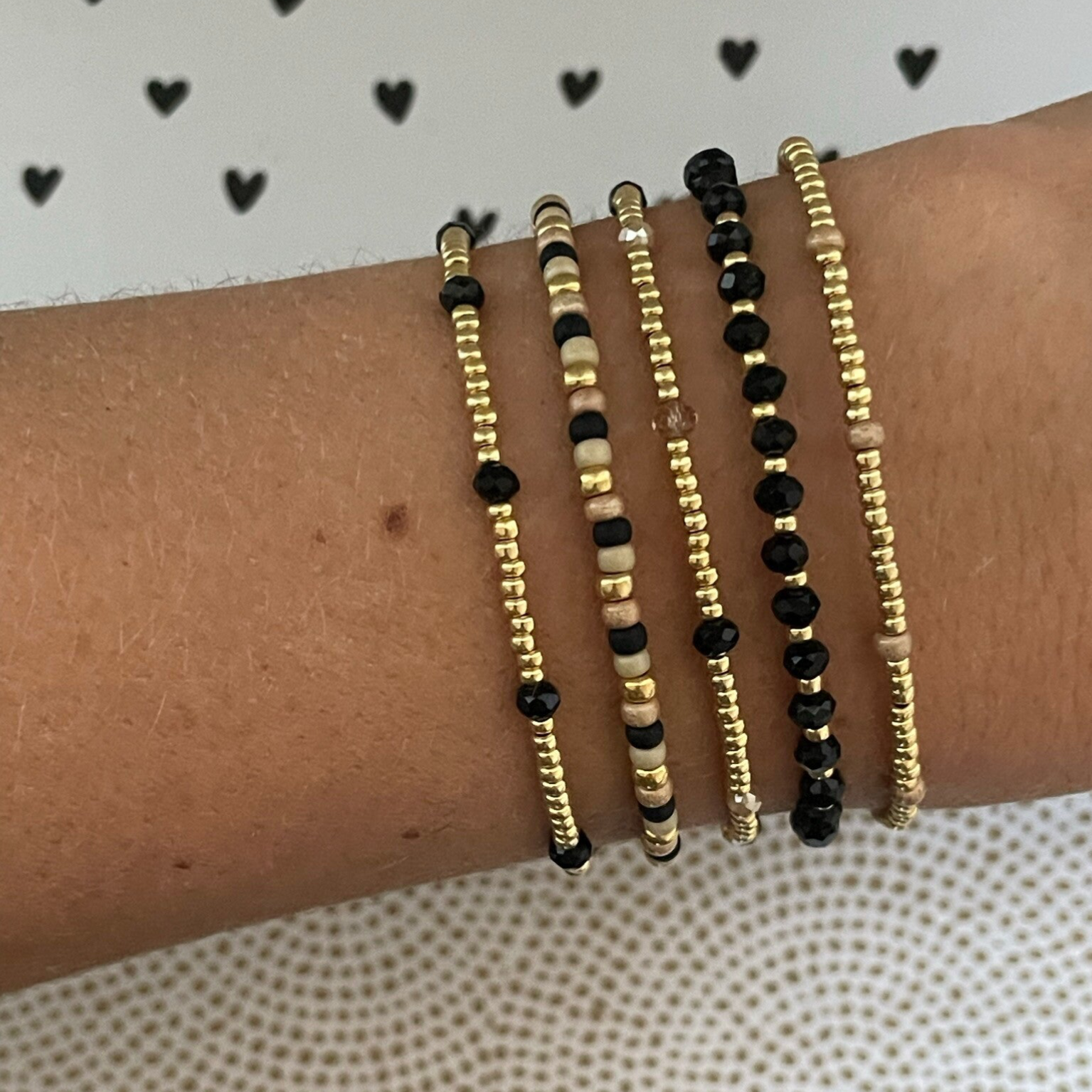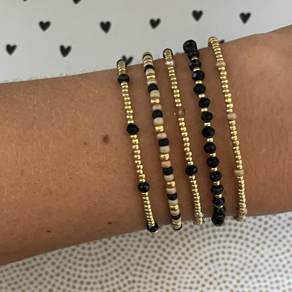 Je kunt de armbanden allemaal super mooi met elkaar mixen en matchen. De kralen zijn 2mm of 3mm miyuki rocailles glaskralen van zeer goede kwaliteit gecombineerd met prachtige facetkralen. Alles in de kleuren, zwart, goud, taupe & caramel.