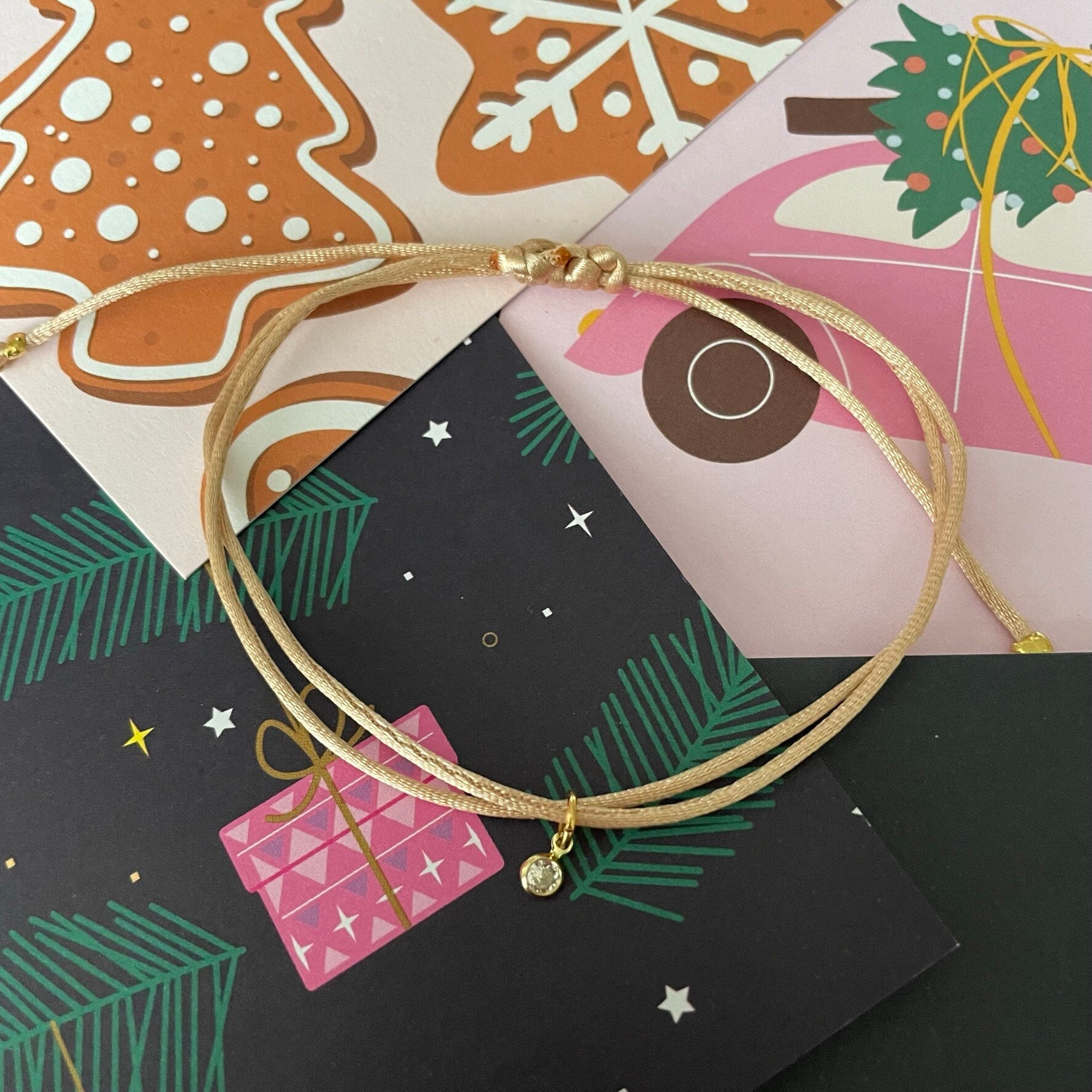 Mooi armbandje van satijn koord met een handige schuifknoop sluiting. Bedeltje met sparkle maakt dit armbandje helemaal feestdagen proof. Omdat je de armband krijgt om een kerstkaart is het ook een heel tof cadeau om weg te geven of naar iemand op te sturen.