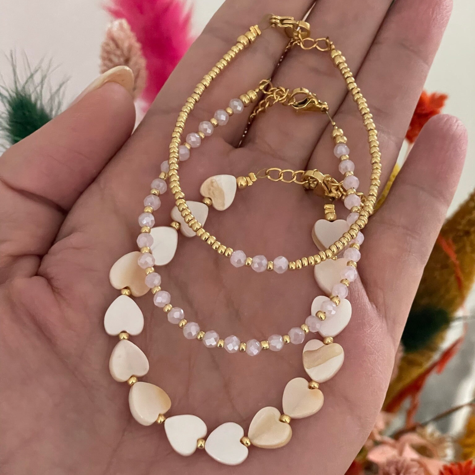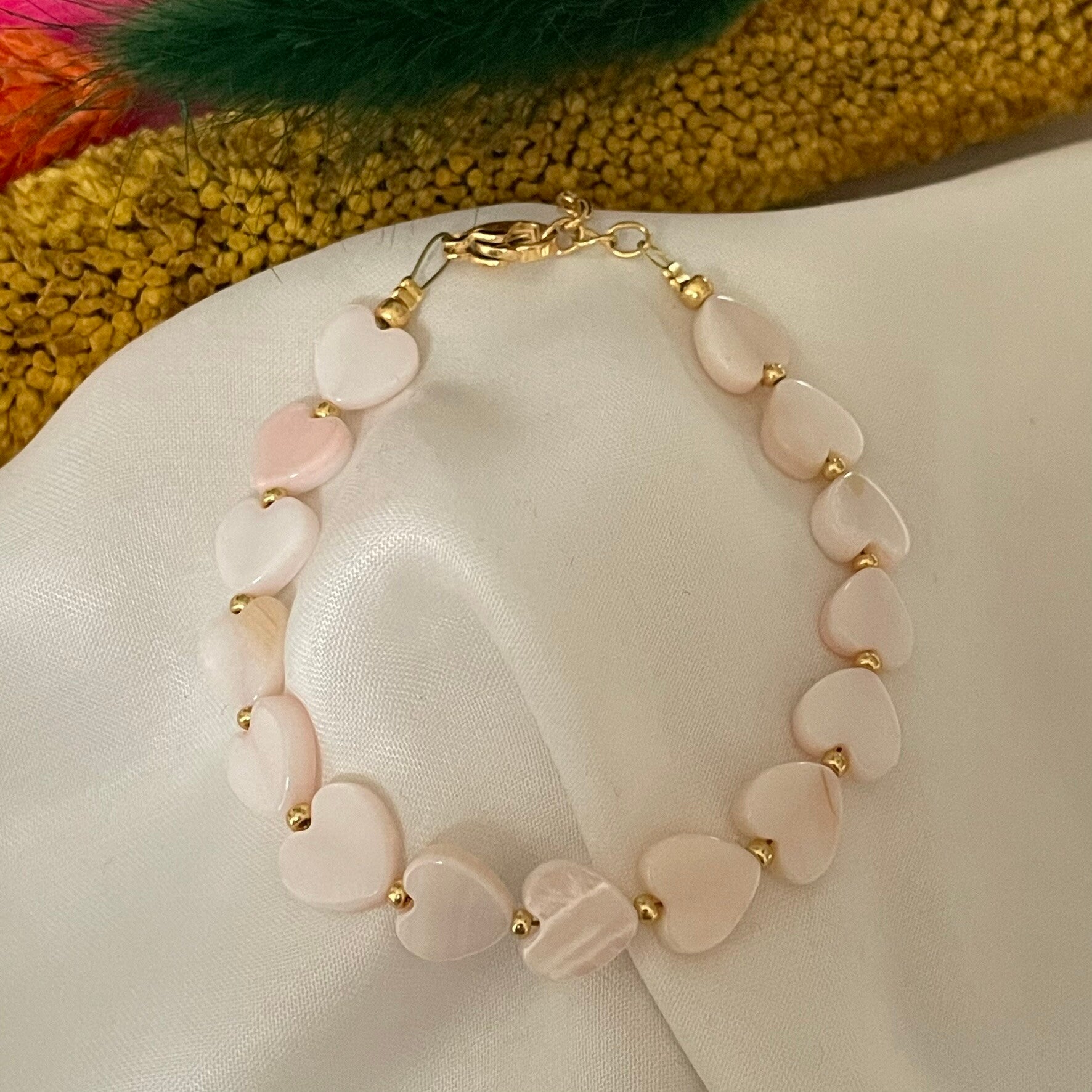De hartjes kralen zijn 8mm schelpkralen in het taupe/zachtroze lichtblauw/taupe, iedere schelpkraal is anders dus elke hartjesarmband is uniek. Tussen de hartjes kralen zitten 2mm gouden miyuki kralen met een coating.