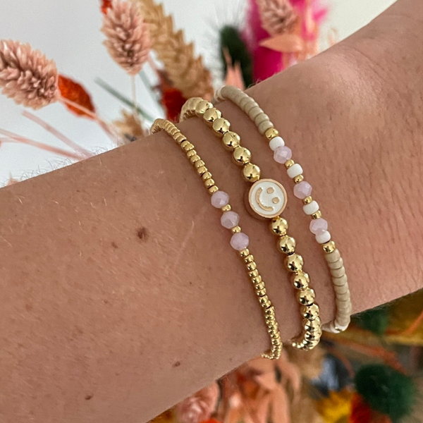 Prachtige elastische 4mm kralenarmband met een witte smiley van de speciale birthday collectie van Label Lazise.