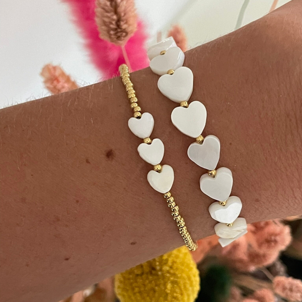 De favoriet van de zomer is de witte hartjes armband, de mooie schelphartjes in de mix met de 2mm miyuki kralen in het goud.