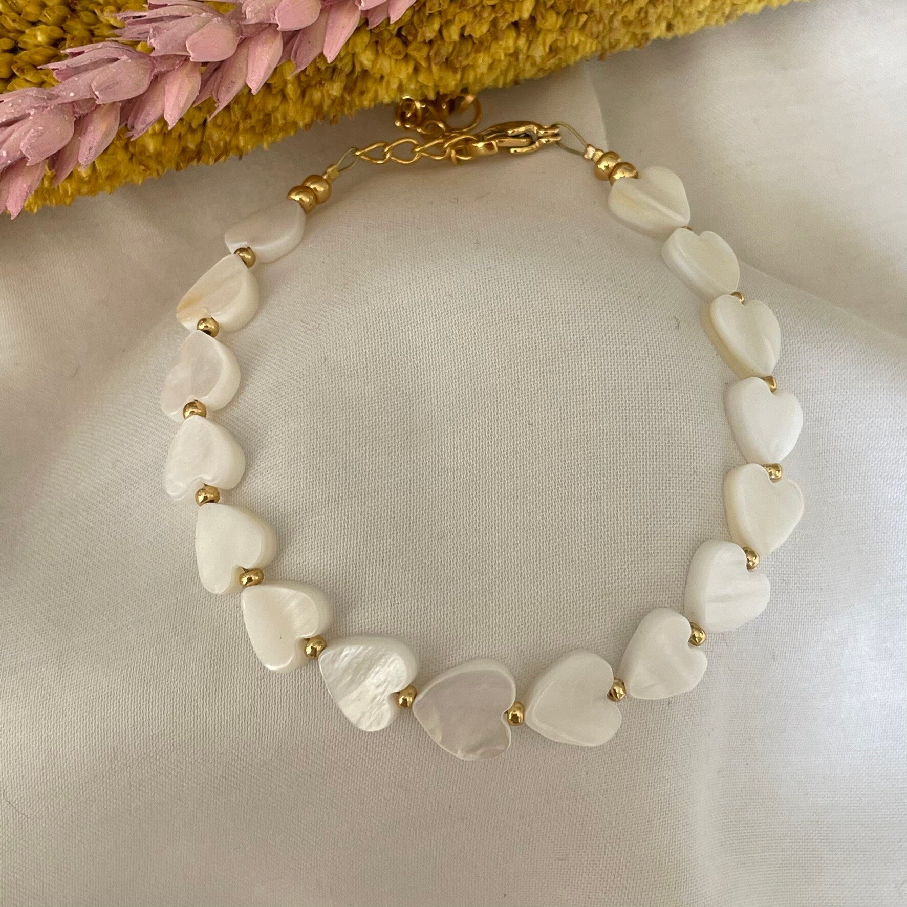 De favoriet van de zomer is de witte hartjes armband, de mooie schelphartjes in de mix met de 2mm miyuki kralen in het goud.