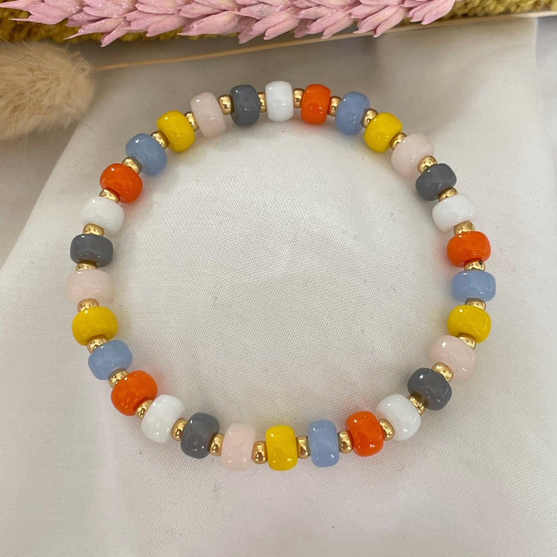 De heerlijke gekleurde glaskralen met de miyuki kralen in het goud in de mix. Super leuk om te combineren met de andere armbanden van de zomercollectie.