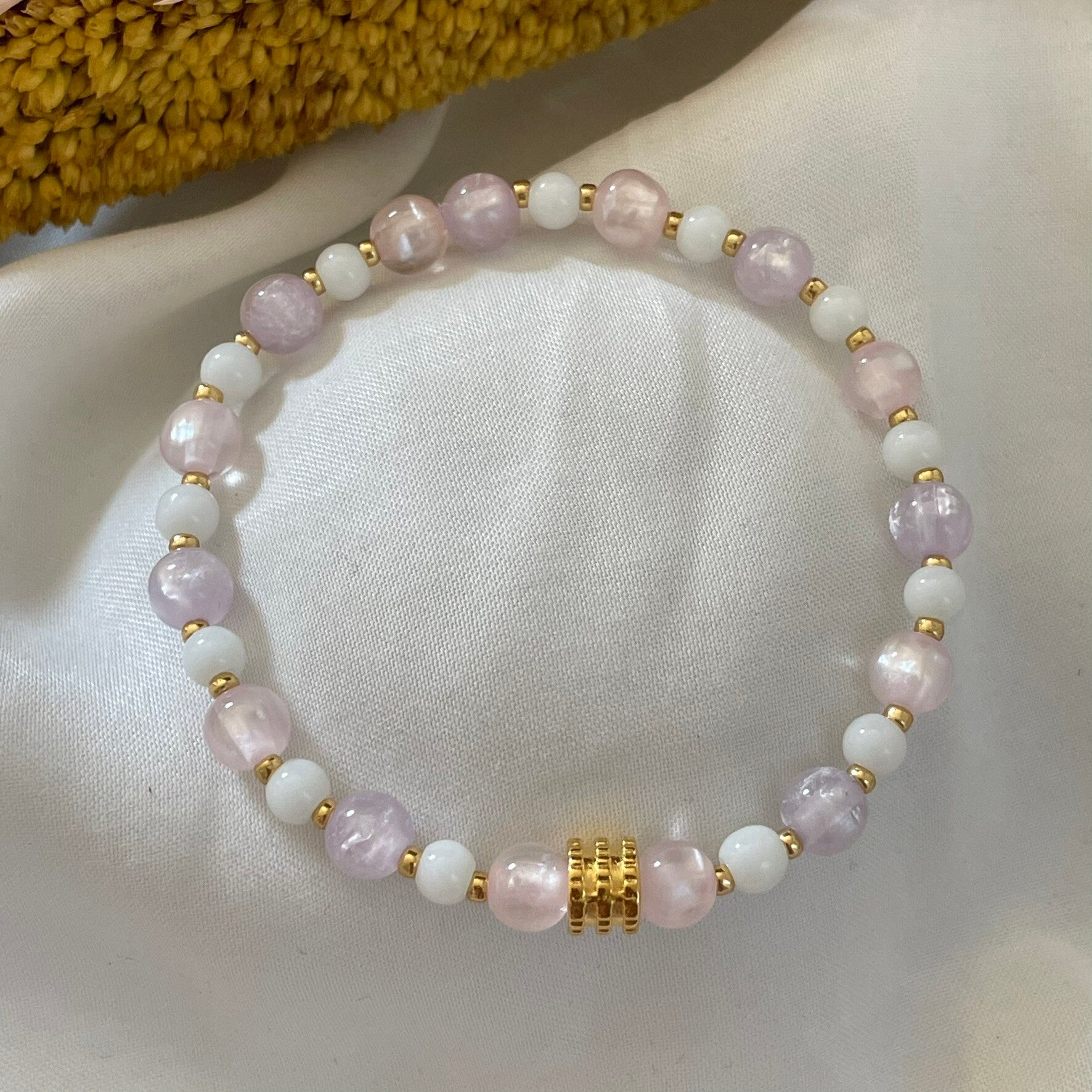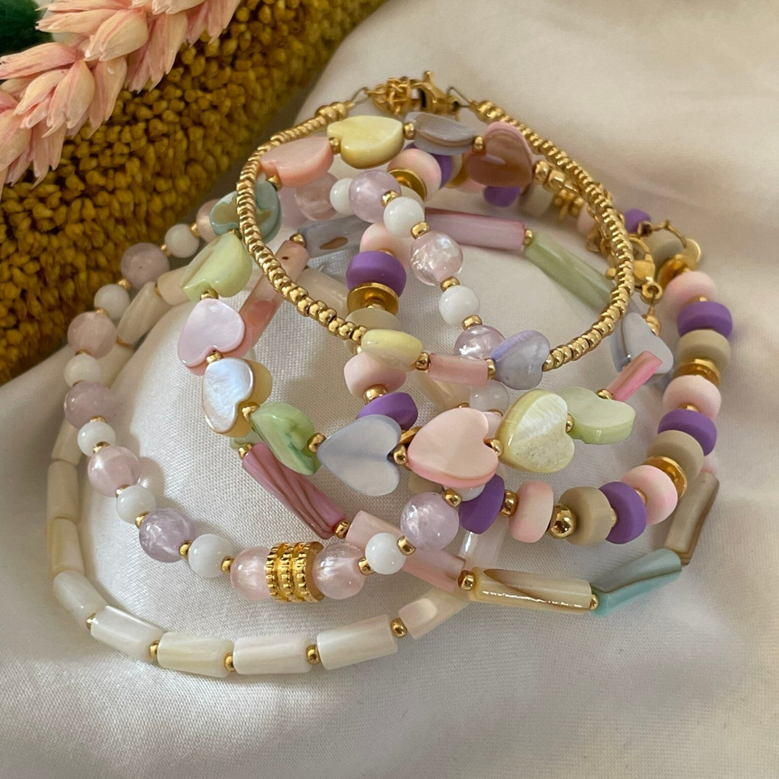 Het mooie zachtroze, lila en wit met goud in de mix, super leuk als aanvulling op je eigen armbandenset of om samen te dragen met de schelp pastel armband of de metallic armbandjes in het roze, paars en beige.