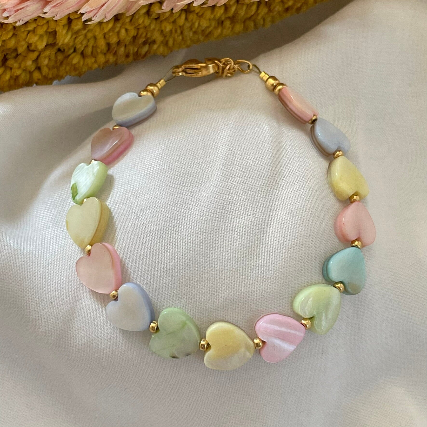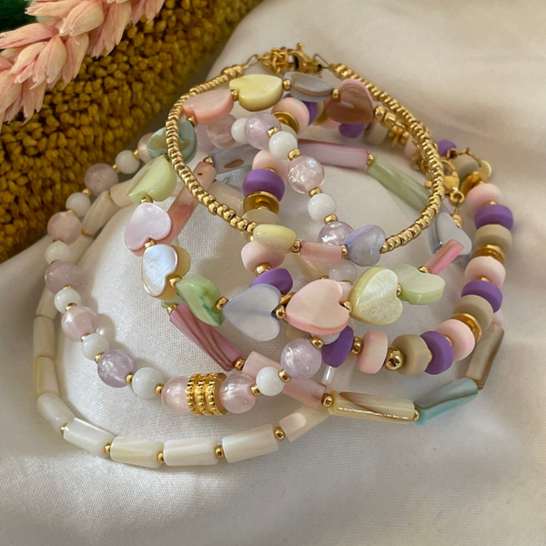 De favoriet van de zomer is de witte hartjes armband, en nu shop je deze dus ook in gave pastel tinten. De mooie schelphartjes in de mix met de 2mm miyuki kralen in het goud.