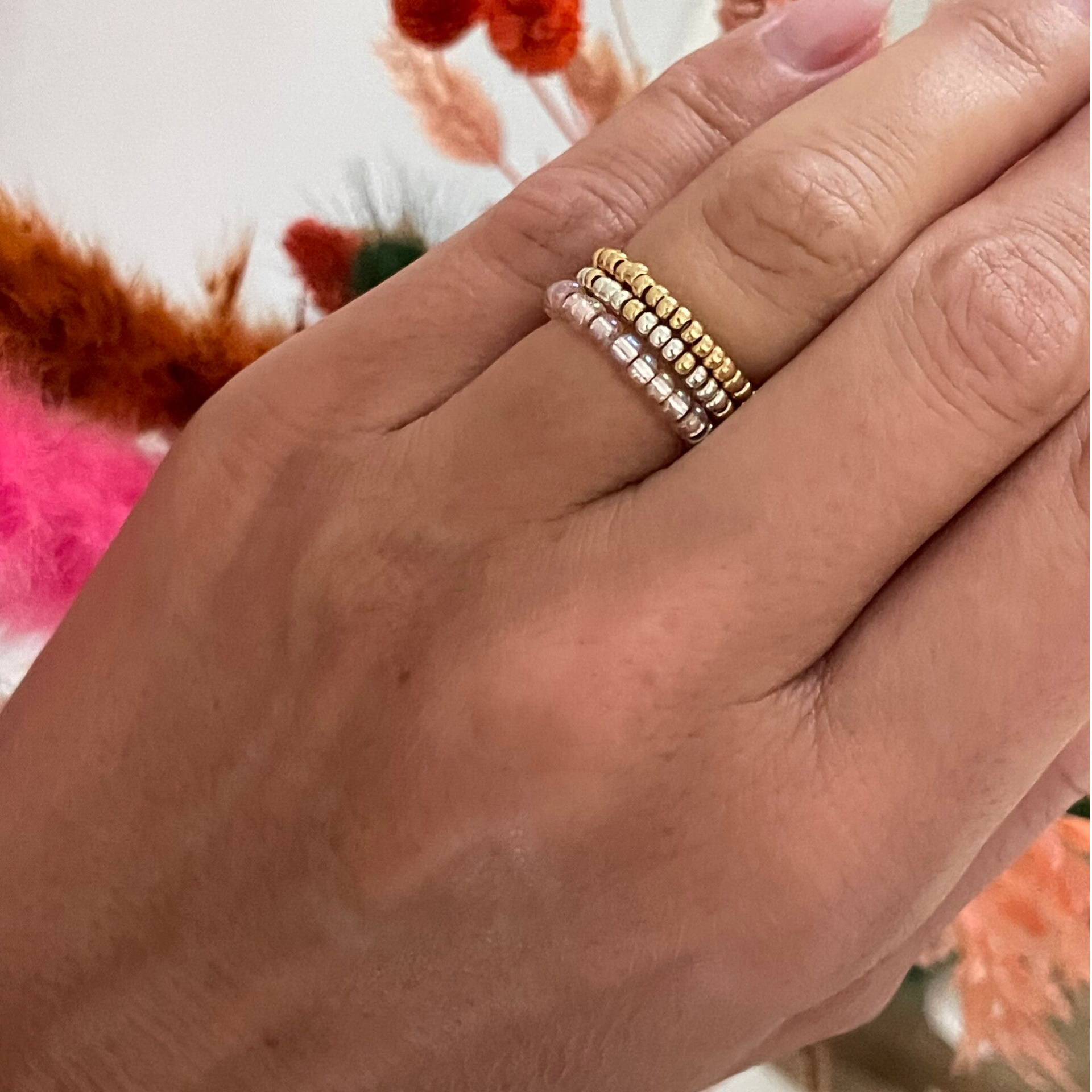 Je kunt de ringen allemaal super mooi met elkaar mixen en matchen. De kralen zijn 2mm of 3mm miyuki rocailles glaskralen van zeer goede kwaliteit gecombineerd met een facetkraal of parel. Alles in de kleuren, goud, beige, blauw, roze en zilver.