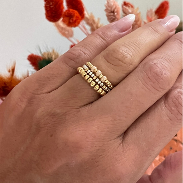 Je kunt de ringen allemaal super mooi met elkaar mixen en matchen. De kralen zijn 2mm of 3mm miyuki rocailles glaskralen van zeer goede kwaliteit gecombineerd met een facetkraal of parel. Alles in de kleuren, goud, beige, blauw, roze en zilver.