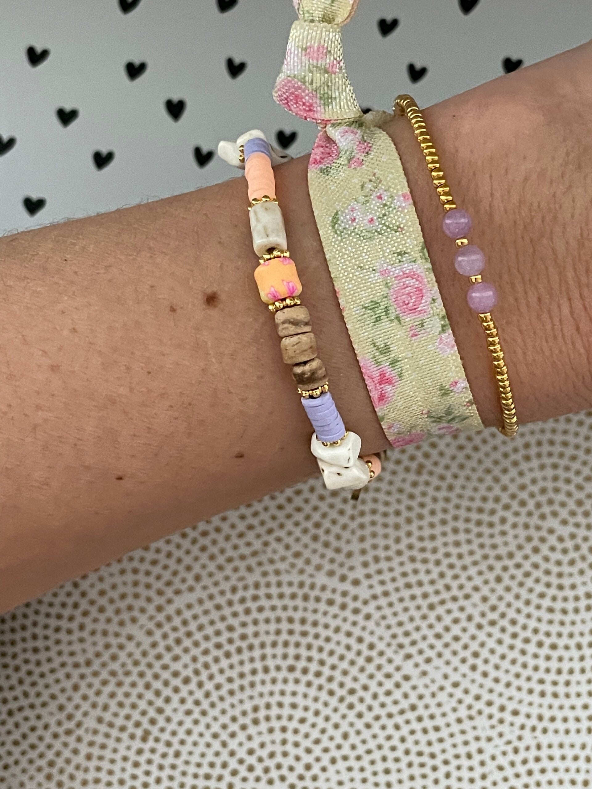 Bloom with grace! Mooi setje van 3 Ibiza elastiekjes in zachte kleurtjes met een leuke bloemenprint en een kleine hartje bedel.